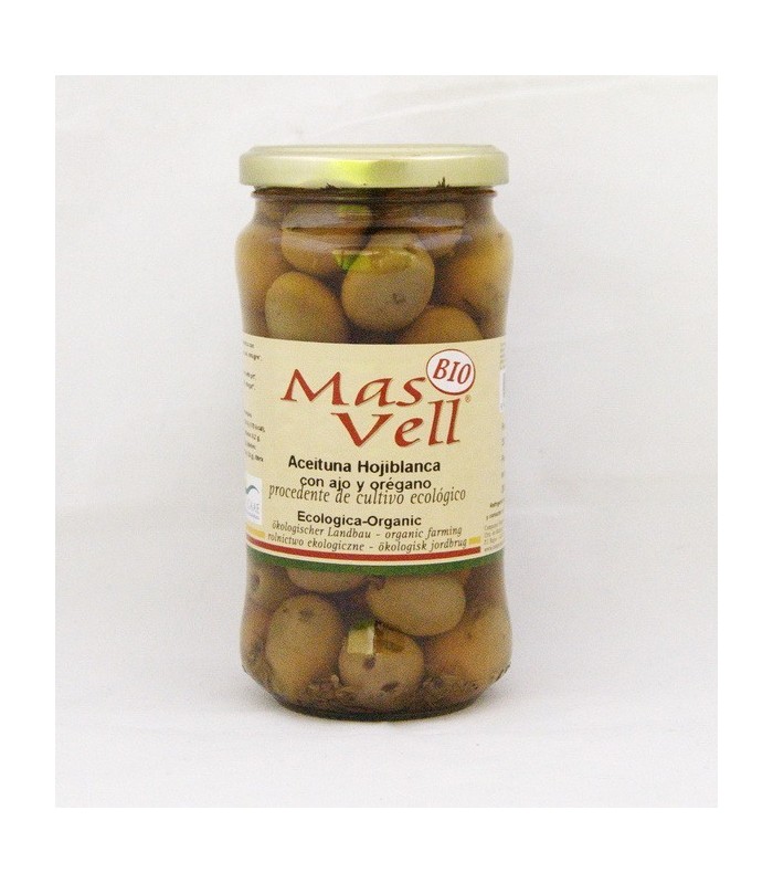 Aceitunas hojiblanca con ajo y orégano ecológ., 350 gr.