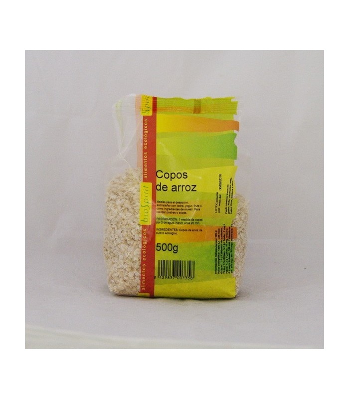 Ingredientes: copos de arroz de cultivo ecológico. Ideales para el desayuno, acompañar la leche, yogur, friua o como ingrediente del muesli. Para realizar postres o sopas. Preparación: 1 medida de copos por 2 da agua. Hervir unos 20 minutos. Trazas de gluten, leche, cacahuetes, soja, frutos secos, mostaza y sésamo