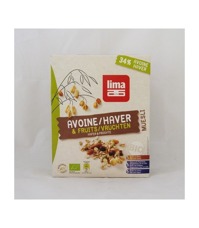 Ingredientes: copos de avena integral* 34,40%, pasas sultanas* 14%, copos de trigo* (trigo, jarabe de malta* (cebada)), semillas de girasol*, pasas*, dátiles*, albaricoques*, plátano*, avellanas 1%, semillas de calabaza*, almendra* 1%