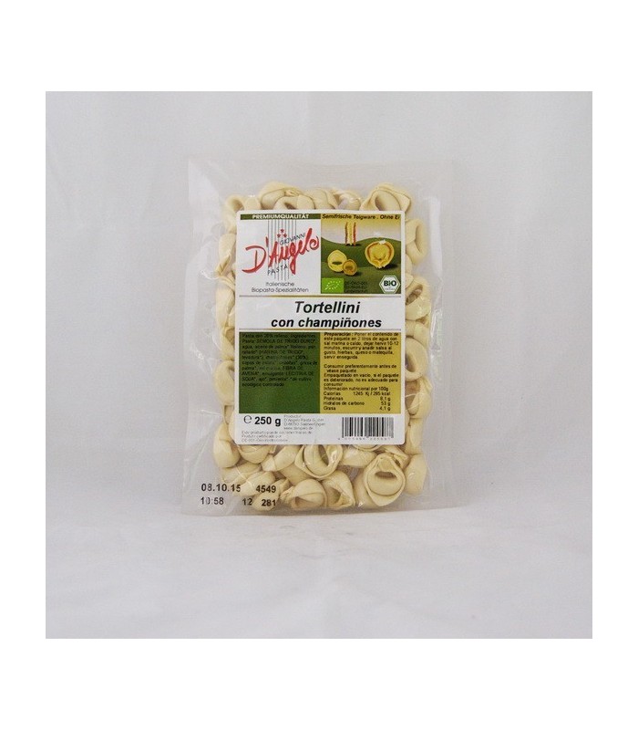 Pasta con 26% de relleno Ingredientes: sémola de trigo duro*, aceite de palma*, agua. Relleno: pan rallado* (harina de trigo*, levadura), champiñones* 30%, copos de patata*, cebolla*, grasa de palma*, sal marina. Fibra de avena*, emulgente: lecitina de soja, ajo*, pimienta* * procedente de cultivo ecológico Preparación: poner el contenido de este paquete en 2 litros de agua con sal marina o caldo. Dejar hervir 10-12 minutos, escurrir y añadir salsa al gusto, hierbas, queso, mantequilla, servir enseguida